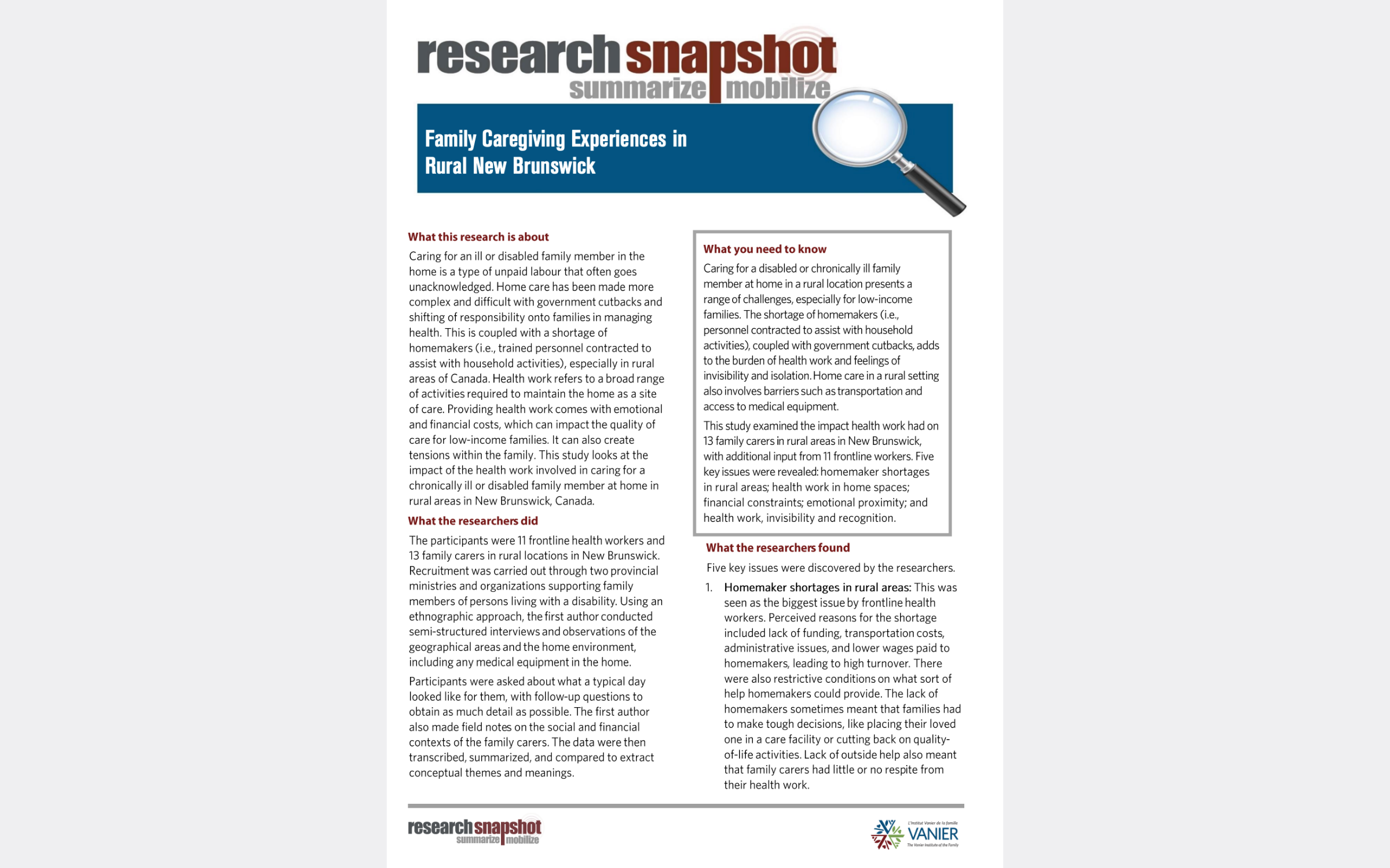 This research summary (3 pages) looks at a study on the impact of providing home care in rural regions of New Brunswick.
